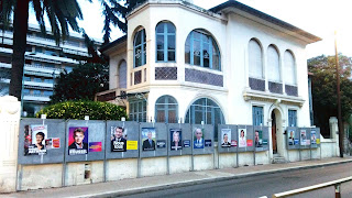 Menunggu bus, kami lihat papan kampanye pemilu presiden Prancis di bangunan di belakang halte. Memang di situ rutin digunakan sebagai tempat pemungutan suara...
